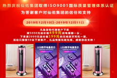 2019-12-10 17:28:10熱烈慶祝仙佑企業取得ISO9001國際質量體系認證,為答謝客戶對仙佑企業的信任和支持: 2019年12月10日-2019年12月11日,凡批發和代理客戶下單,滿5000元送價值 499元 的電暖氣一臺,下單滿